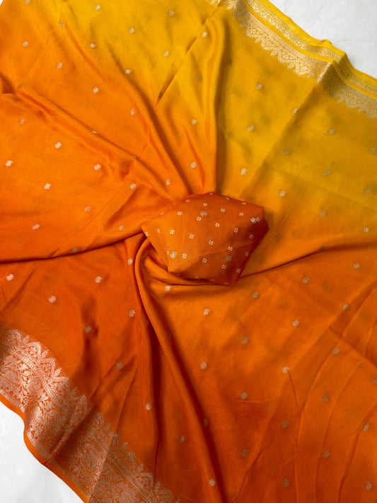 This saree features a striking sun-yellow to royal-purple ombrรฉ blend, creating a vibrant festive statement. The entire saree is enhanced with delicate buttis across the body and finished with a heavy embroidered designer border with fine sequence detailing, adding luxurious depth and sparkle.