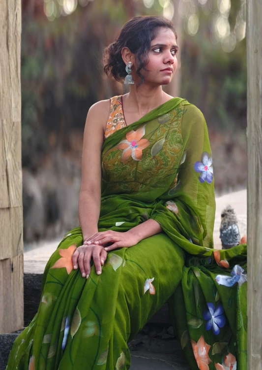 Verdant Bloom Pure Chiffon Handpainted Saree