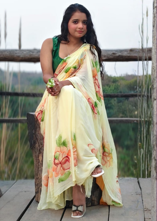 SaleButtercream Bloom Pure Chiffon Handpainted Saree