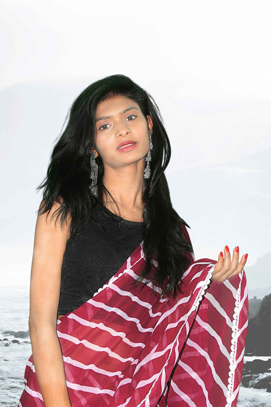 Regular price Rs. 4,268.75 INR -37% OFFRegular priceUnit price / perRs. 6,830.00 INRSale price Rs. 4,268.75 INR🔥 Hurry! Limited time offer💵 COD Available 🚚 Free ShippingInclusive of all taxesDrape yourself in sheer elegance with Aafreen, a mesmerizing georgette Laheriya saree that captures the essence of heritage craftsmanship with a contemporary twist. Featuring flowing waves of traditional Laheriya print in a striking combination of deep wine and pristine white, this saree celebrates grace, movement, and modern ethnic flair.