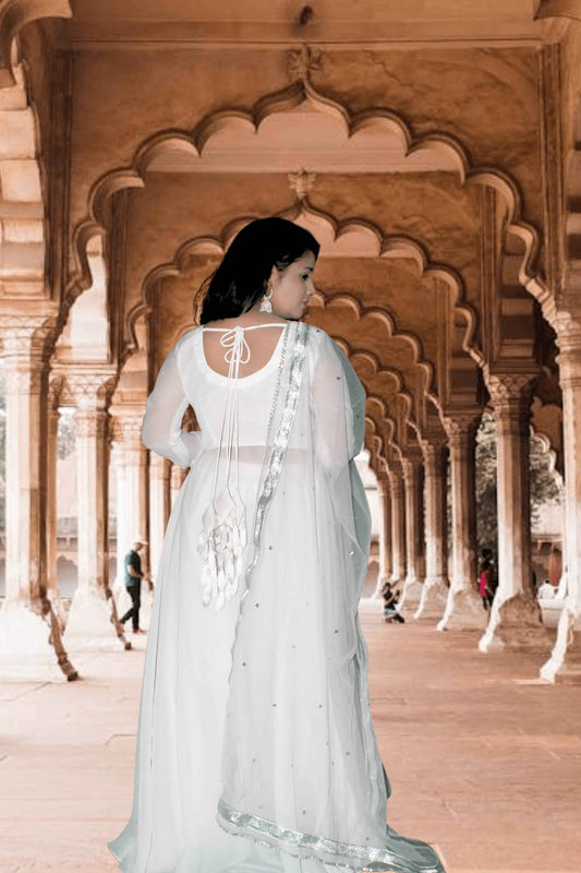 Dry clean recommended to preserve the embroidery and silk texture. Iron inside out on low heat.SaleRoohani Adaa White Anarkali Set