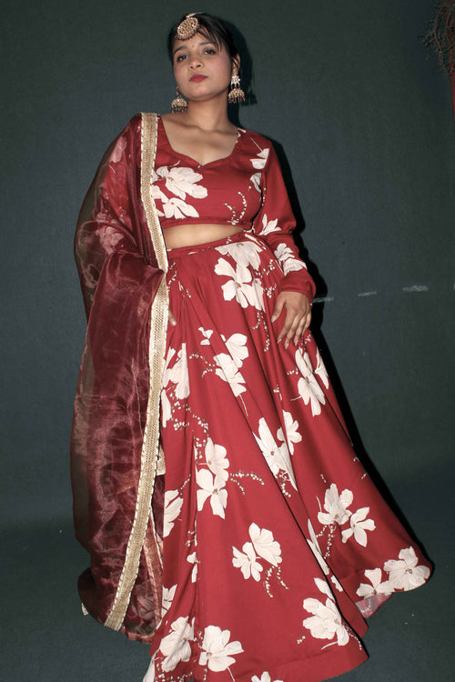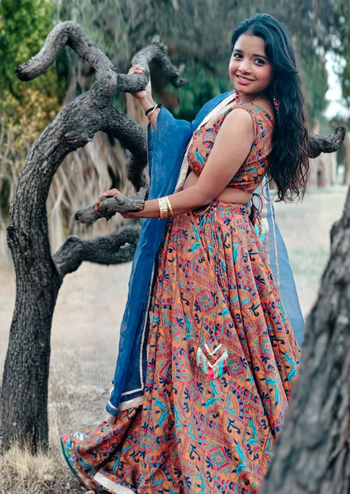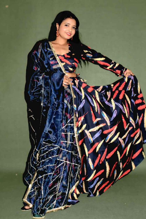 The skirt, dupatta, and cape top ensemble is highlighted by shimmering fox chitra silk, renowned for its rich texture and radiant shine. The matching dupatta gleams with intricate embroidered borders, adding regal opulence to the flowing look. Designed for festive evenings, receptions, and elegant parties, this set guarantees effortless style and show-stopping presence.