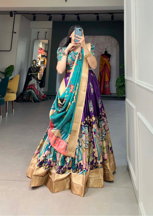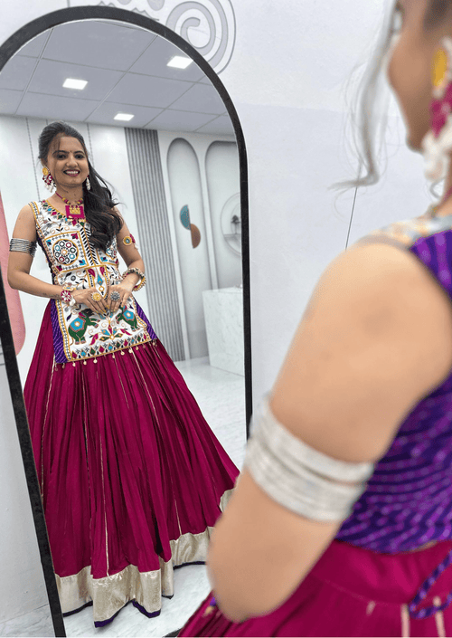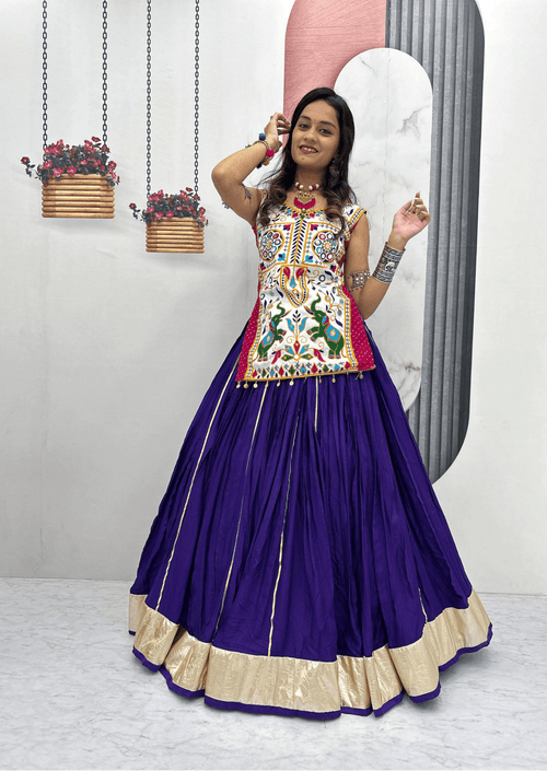 Regular price Rs. 3,933.13 INR -37% OFFRegular priceUnit price / perRs. 6,293.00 INRSale price Rs. 3,933.13 INR๐ฅ Hurry! Limited time offer๐ต COD Available ๐ Free ShippingInclusive of all taxesStep into regal splendor with the Royal Purple Vichitra Silk Embroidered Cape Lehenga Setโcrafted to embody classic sophistication and festival grandeur. The ensemble features a full-flare skirt (lehenga) in a rich purple shade, tailored from high-quality vichitra silk renowned for its lustrous shine and luxurious drape. Complete lining ensures comfort and smooth flow (lehenga length: 40"), ideal for extended celebrations.