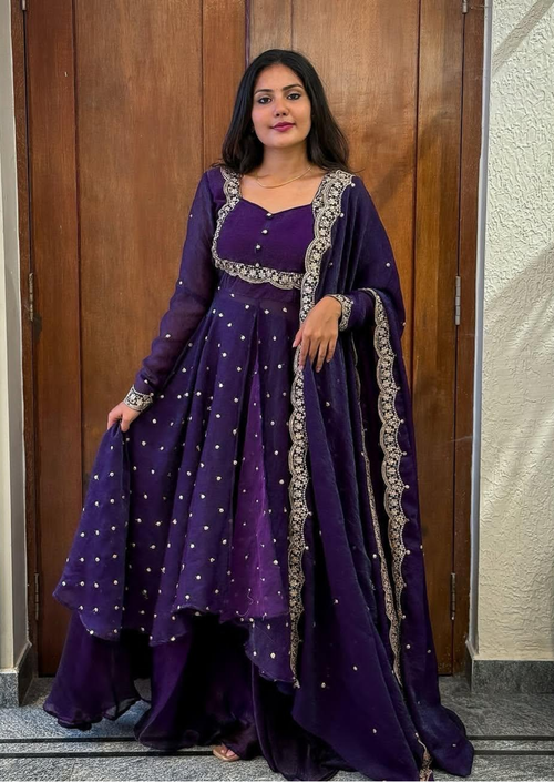 Dry clean recommended to preserve delicate embroidery and silk texture. Iron inside out on low heat.SaleRoyal Purple Silk Embroidered Cape Anarkali Suit Set
