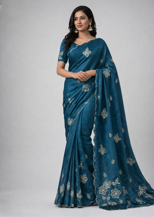 Paired with a beautifully detailed blouse, this saree is ideal for engagement ceremonies, receptions, cocktail evenings, and premium festive gatherings.