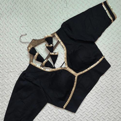The striking black base is enhanced with shimmering gold sequins meticulously embroidered across the neckline, bust line, and sleeve edges, adding a refined sparkle to every movement. A contemporary cut-out back, completed with playful bow-ties and matching tassels, makes Avira Noir the ideal pairing for both traditional sarees and fusion ensembles.