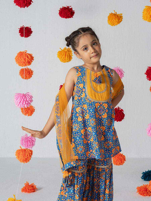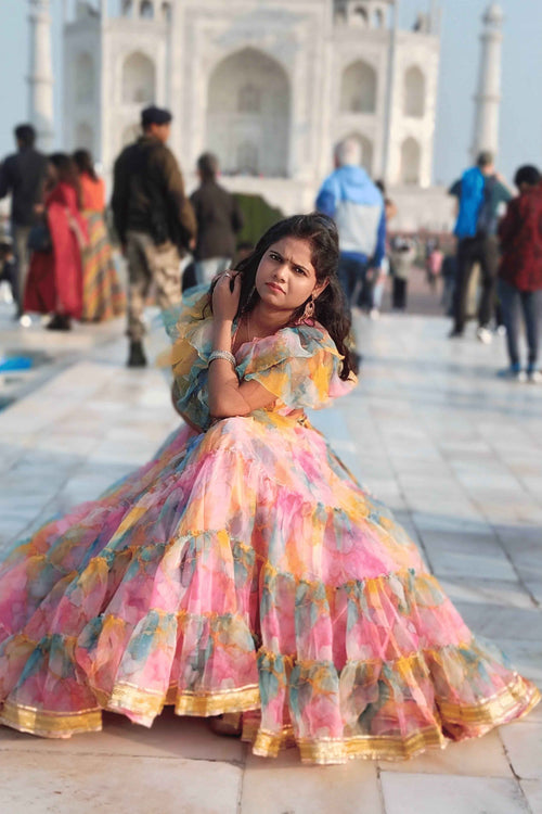 The contrast blouse complements the vibrant palette, making it a perfect choice for haldi ceremonies, festive celebrations, sangeet nights, and wedding functions.