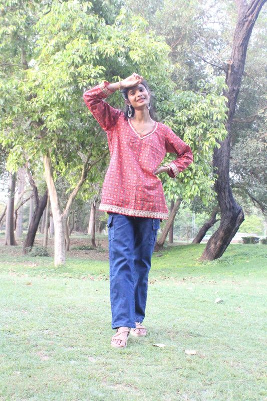 Regular price Rs. 730.63 INR -37% OFFRegular priceUnit price / perRs. 1,169.00 INRSale price Rs. 730.63 INR🔥 Hurry! Limited time offer💵 COD Available 🚚 Free ShippingInclusive of all taxesStep into timeless charm with the Rust Red Ajrak Elegance Kurti — a beautiful tribute to heritage craft and everyday grace. Inspired by the rich legacy of Ajrak printing, this kurti features traditional geometric motifs in earthy rust tones, enhanced with thoughtful design details that elevate its appeal.