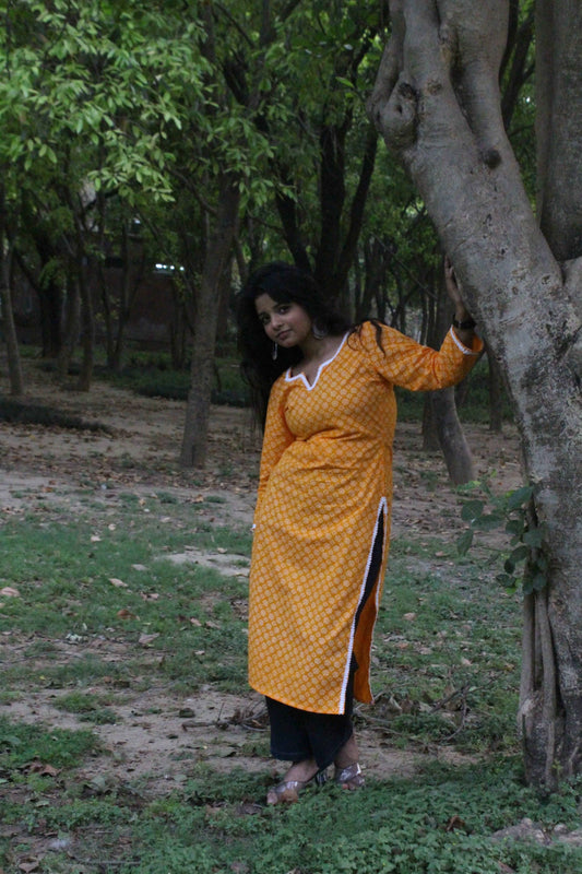 Crafted from breathable pure cotton, the kurti is designed for comfort and style. The V-cut neckline and hemline are accented with delicate golden lacework, giving it just the right amount of shimmer. With its sleeveless cut and relaxed fit, it's a versatile pick for warm days, casual get-togethers, or cultural college events.