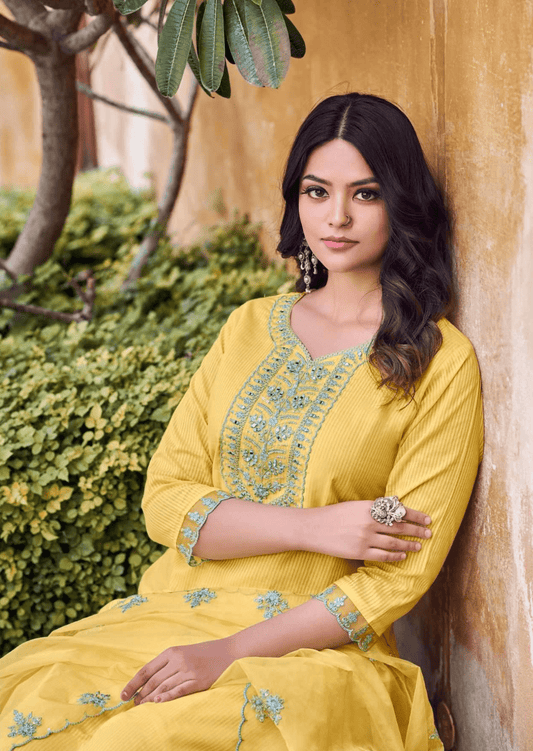Regular price Rs. 3,880.63 INR -37% OFFRegular priceUnit price / perRs. 6,209.00 INRSale price Rs. 3,880.63 INR🔥 Hurry! Limited time offer💵 COD Available 🚚 Free ShippingInclusive of all taxesElevate your ethnic wardrobe with this sophisticated three-piece set. The kurti is crafted from heavy rayon slub fabric, adorned with intricate sequins and coding embroidery work at the neckline for a touch of glamour. The matching bottom is also made from heavy rayon slub, ensuring comfort and a rich drape. The ensemble is completed by a stunning pure organza jacquard dupatta featuring detailed woven patterns and a contemporary color palette, adding a dash of elegance and refinement.