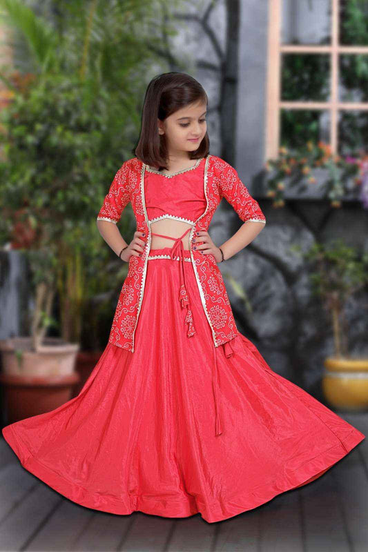 Crafted from premium fancy fabric, the outfit includes a flowy flared lehenga, a matching choli (top), and an elegant jacket with printed detail and tie-up accents. The bright red hue adds a bold pop of tradition and trend, while the cut and silhouette allow for maximum twirl power and comfort.