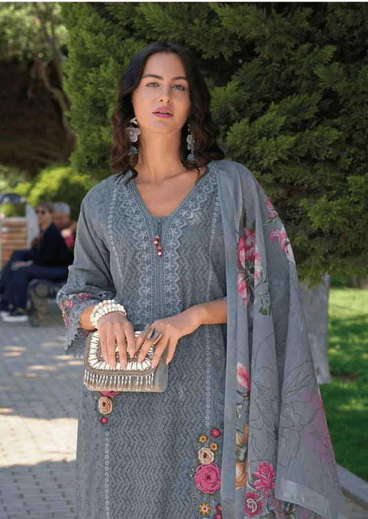 ✨ Occasion: Casual Chic / Daytime Festive Wear / EidSaleZeenat Graceful Grey Floral Embroidered Cotton Suit