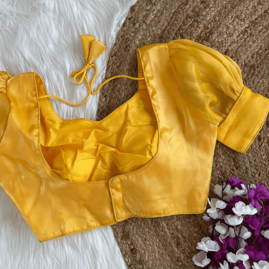 Distinctive organza puff sleeves create dramatic volume and eye-catching elegance, perfectly balanced by a chic, V-shaped neckline and a refined back tie-up fastening. Precision tailoring ensures this blouse flatters every silhouette, pairing beautifully with sarees, lehengas, or fusion skirts for weddings, parties, or upscale events.