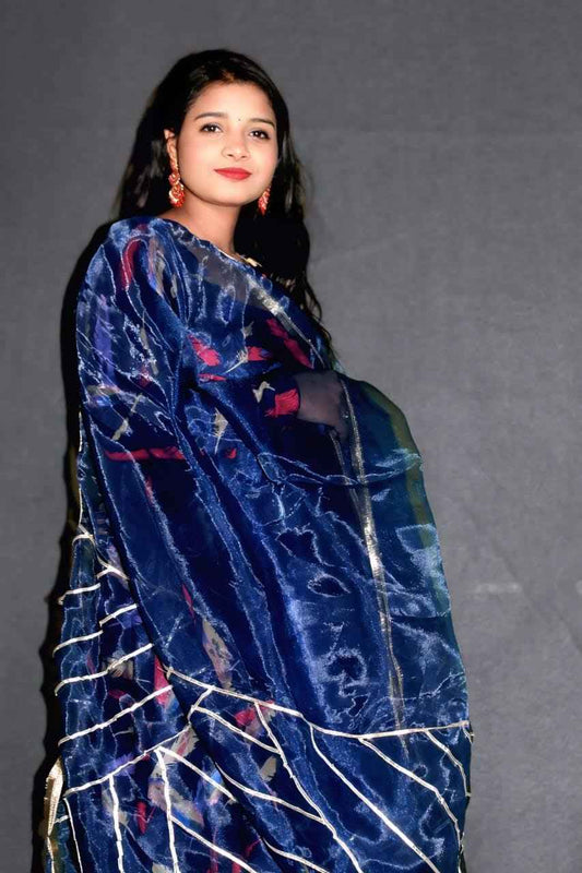 Dupatta: Lightweight navy net dupatta with golden lace border