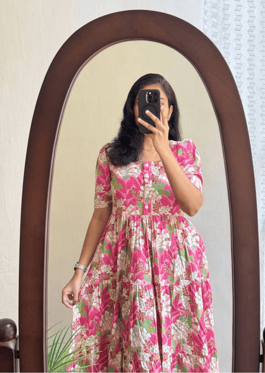 Regular price Rs. 2,371.25 INR -37% OFFRegular priceUnit price / perRs. 3,794.00 INRSale price Rs. 2,371.25 INR🔥 Hurry! Limited time offer💵 COD Available 🚚 Free ShippingInclusive of all taxesPresenting our Timeless Floral Soft Cotton Midi Dress—a perfect blend of elegant prints, vibrant hues, and effortless comfort for every season. Crafted from pure, rich soft cotton, this dress boasts a beautiful all-over flower pattern in shades of pink, green, and white, designed to capture attention with its striking color palette. Its lightweight, breathable fabric keeps you feeling fresh and at ease, whether for a casual day out, lunch with friends, or a dressy formal outing.