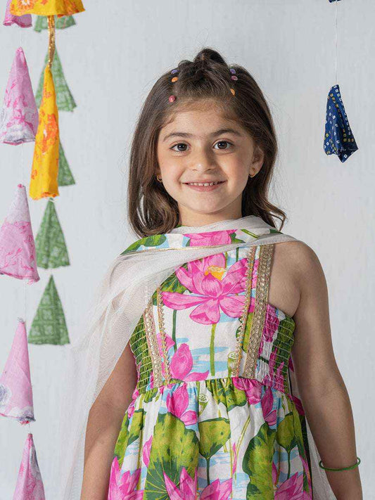 A delicate white dupatta adds a graceful traditional touch, making this ensemble a must-have for every little fashionista.