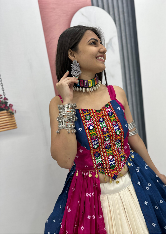 टॉप: बंधेज प्रिंट, गमाथी कढ़ाई, असली मिरर वर्क, पूरी तरह से सिला हुआ, माइक्रो कॉटन लाइनिंग, बिल्ट-इन कप, एडजस्टेबल साइज़ (M से L, XL से XXL)