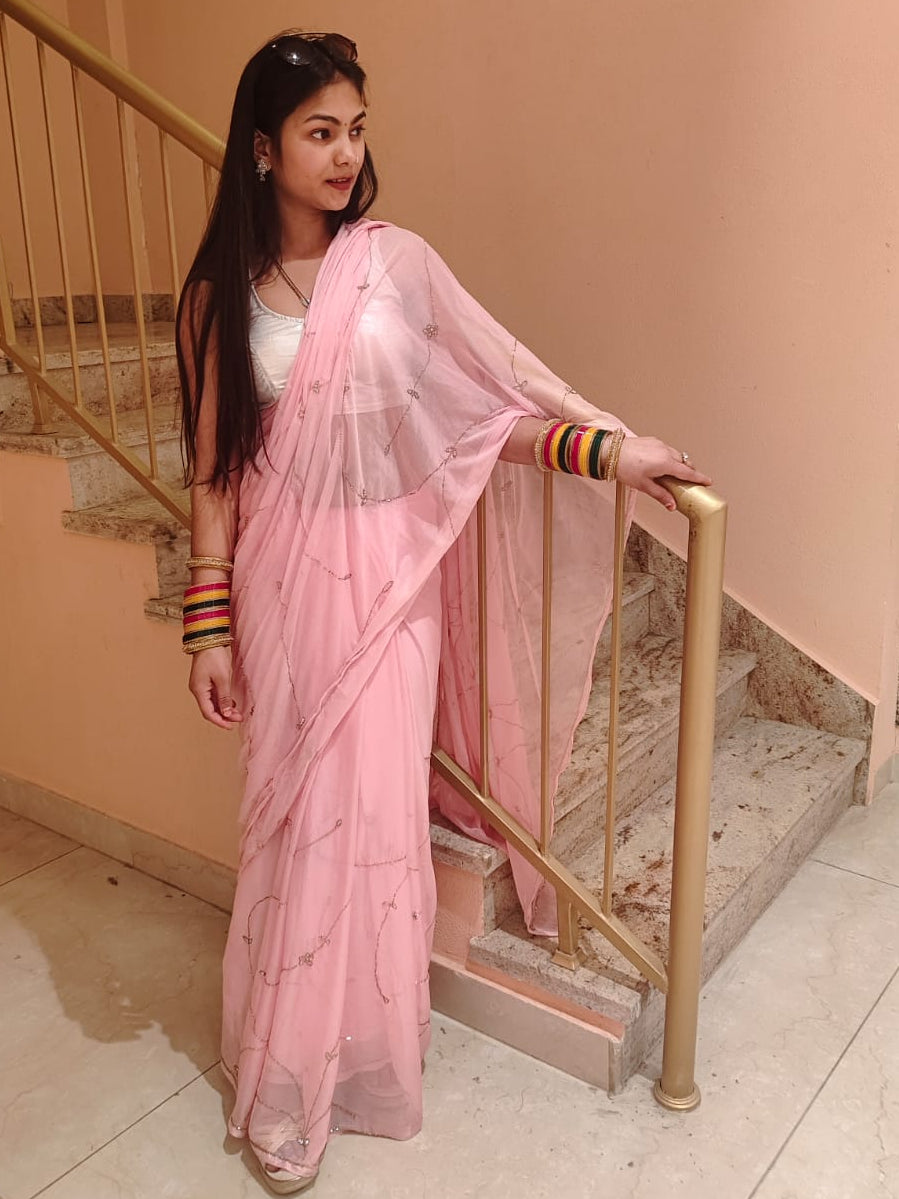 Feature Details Fabric Ultra-fine Premium Chiffon Color Sophisticated Pastel Pink Craftsmanship Hand-applied Cut-Dana & Reflective Diamond Accents Pattern Delicate Linear & Floral Embellishments Saree Length 5.5 Meters (Approx) Blouse Piece stitched Included (Customizable) Care Professional Dry Clean Only